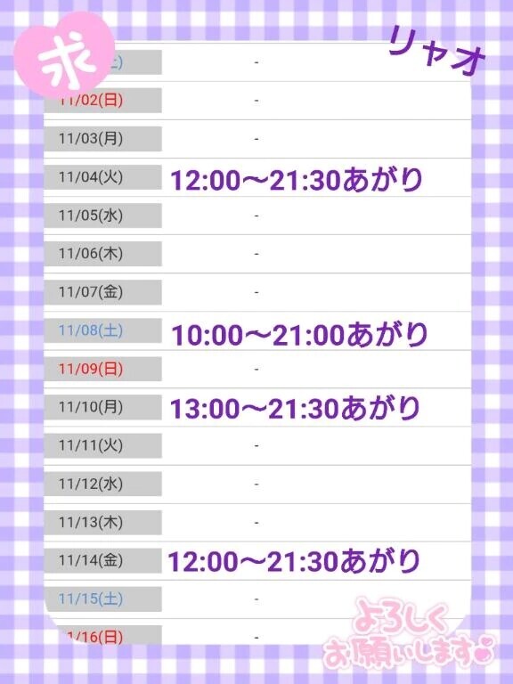 10月まだ1週間ありますが。。。来月11月前半の出勤日が決まりましたぜひぜひリャオと会える日作ってほしいなぁよろしくお願いしま〜す