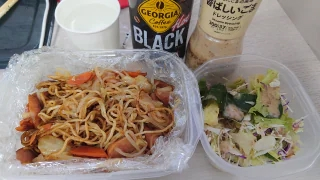 こんにちは昼職の休憩中今日は焼きそばは作って野菜サラダも持ってきました今日の昼職もなんだかんだと忙しい