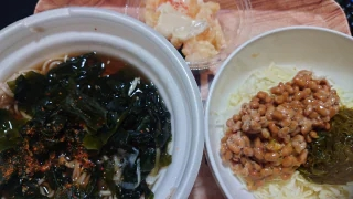 帰宅後飲みました〜食べました〜今夜はわかめそばめかぶ納豆サラダエビマヨ美味しく頂きました〜