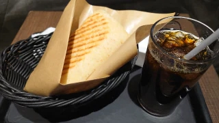 軽めに食べてま〜すアイスコーヒーパニーニ(ハムと2種のチーズ)ハフハフしながら食べました