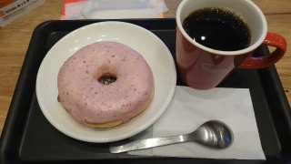 今はコーヒータイム中ホットコーヒーストロベリーリング🍩ドーナツ🍩食べれるしあわせ