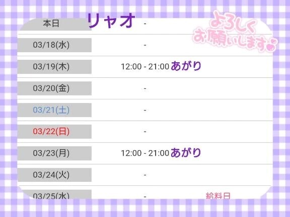 リャオの今月の出勤日は今週木曜日日そして来週月曜日日この2日間となりますはじめましてさまも本指名さまもぜひぜひリャオとイチャイチャしましょご予約お誘いよろしくお願いしま〜す
