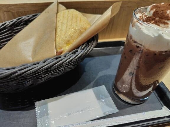 こんにちは😊本日のランチはBECKSのハムと2種のチーズにアイスココアでした☕今日は昨日と違い、暇なので、寝そう😴ドラマ観ます📺️