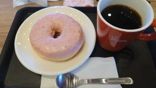 季節限定のドーナツほかのも気になるけど前に食べた1個が思ってた以上に甘かったのでほかのも甘いのかな、と思って選んでないということでホットコーヒーそしてストロベリーリング🍩を選んでしまう