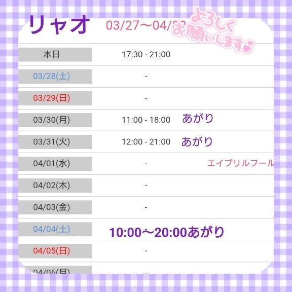 やっと来週の出勤日が決定3月は来週も出勤できる嬉しさ日㈪:〜:あがり日㈫:〜:あがりそして月になりますね日㈯:〜:あがり出勤しますイチャイチャしましょ3日間とも出勤時間が違うので確認してくださいねご予約お誘いよろしくお願いしま〜す
