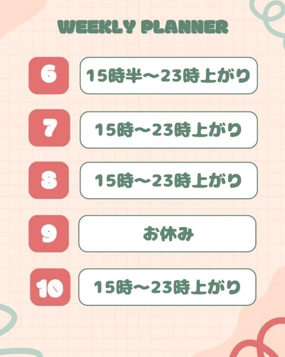 本日出勤してます₊˚⊹ ᰔ急にお休みもらっててごめんね〜今週の予定表!土曜日と日曜日はまだ決まってないよ会いにきてくれると嬉しいです