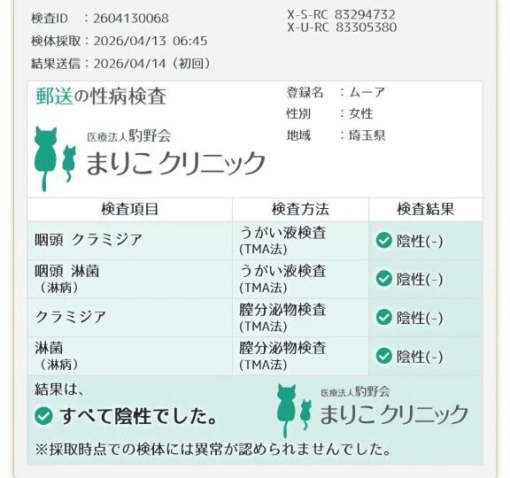 今月の性病検査、異常なしです✌本日は用事がありデッドはお休みですが、明日から、デッドに出勤致します!皆様、ご安心して、ムーアちゃんに会いに来て下さいね🤗