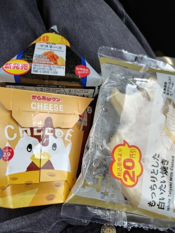 こんばんは🌃本日はお仕事で、デッドをお休みさせていただきました😴急に申し訳ありませんが、また明日、よろしくお願い致します🙇本日のランチは値引きシールが付いていた鮭マヨネーズおにぎりともっちりとした白いたい焼き、クーポンで無料のからあげくんチーズでした🍙
