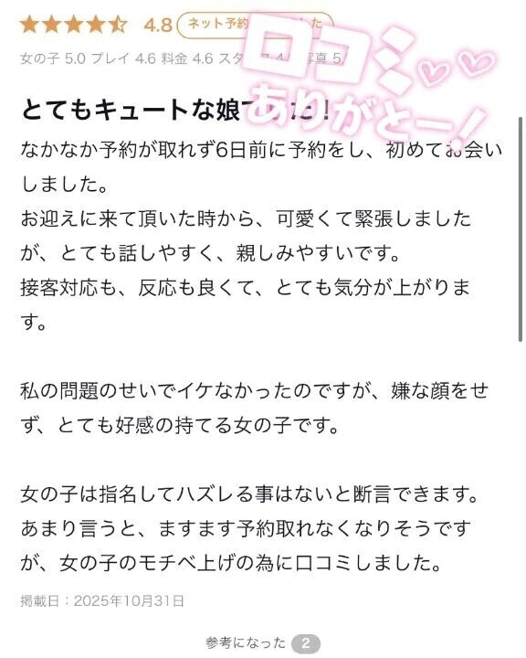 優しい😭💞口コミありがとうございます!それもモチベ上げの為に書いてくれてるって素敵すぎません?ほんとにモチベーションになるので嬉しい🥹💖人見知り発動しなくてよかった♡楽しい時間過ごせたね♡また会いに来てください❣️遅い時間になってごめんね🥲