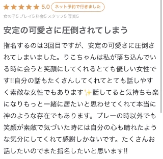 クチコミありがとうー!いつもありがとーね^ ̳⩌ ̫ ⩌ ̳^♡最初の頃より仲良くなれて嬉しいんだ〜あんまりおしゃべしてくれなかったのに、最近はよくしゃべってくれる🤝🏻♡お仕事いつもお疲れ様ね!今月も楽しもうね〜りこ🍒
