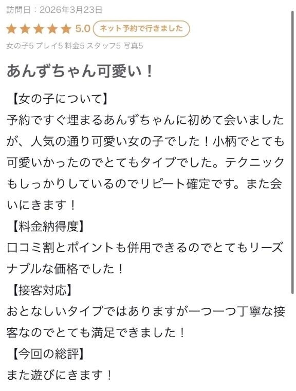 「書くね」って言ってくれた通り書いてくれてありがとう〜> 可愛くてタイプなんて、最高の褒め言葉ありがとう😭テクニックまで褒めてくれてありがとう〜次もあんずにお任せだよ✨お兄さんが楽しんでくれてるのが分かってあんずも楽しかったの覚えてる😌🎀またあんずをリピートしてね!まってます😽