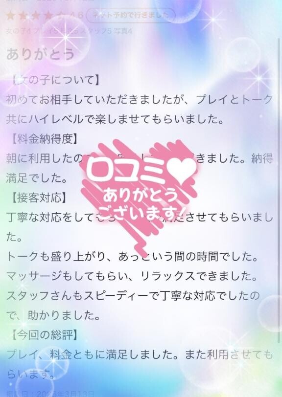 朝早くから来てくれてありがとうございました口コミ感謝!ありがとう色んなことお話し楽しくさせてもらってめちゃくちゃ幸せな朝でした朝から笑うって幸せのんびりお風呂入りながらのおしゃべりも最高の時間でした自分のペースで楽しく毎日を過ごしてね!また朝のお散歩がてらお会いできたら嬉しいし、次はぜひットも口コミ割も忘れずに♡また待ってます♡くれは