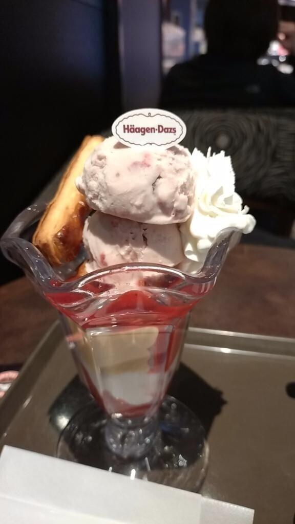 なんか朝から調子良くなくて、ずっと凹んでるから、気分転換にパフェ食べに来た。アイス2個乗ってて、中にはカスタードといちご、ミニパイ、いちごソースが入ってて大満足。ちょっとご機嫌になりました(o・ω・o)