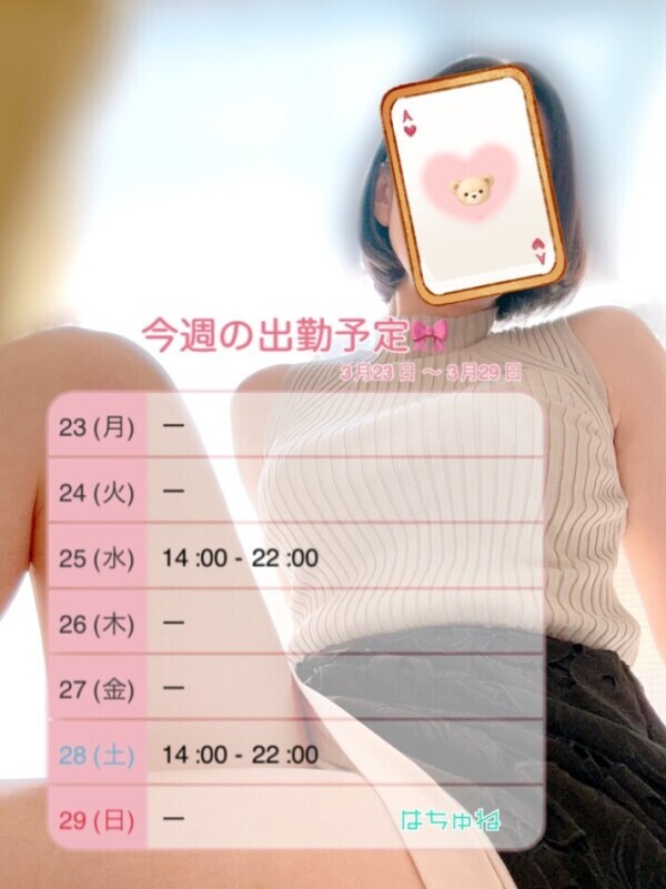 今週の出勤予定🎀✨✨ 25日(土) 14:00 - 22:00 28日(土) 14:00 - 22:00 遊びに来てね💗