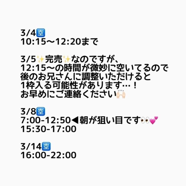来週のシフトなのですが、3/10 7-17時で追加しました✊🏻⭐️少しでも多くのお兄さんにお会いできたらな…と思いまして🥹💭