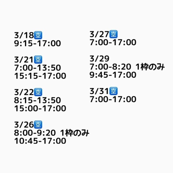 3月日程の🈳です😌🤍今の所、どの日程も比較的ご予約取りやすいです!また、もし可能であれば65分以上のコースでご予約していただけると嬉しいです🥹💭
