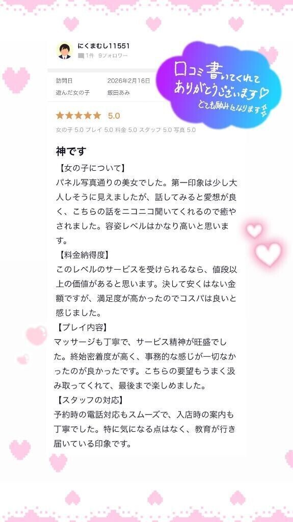 👦🏻⭐️にくまむしさま✨昨日は会ってくださって素敵な口コミまで本当にありがとうございます💕 私もスタッフさんもオール🌟評価5 🌟!と終わったあとのお話ができたのが💬🎀本当に嬉しみでした✨𓂃🎀𓈒𓏸初めましてと重なって初めてのホテルでとっても緊張ましましたが、最後のお話で笑顔が見られて少し安心しました✨️💭〇〇に似てる話とちょっと出る冗談が落ち着いてる方だからギャップも面白くて楽しかったです🐾🌟💘「楽しめた!」って思っていただけたなら本当に本望で、嬉しみです·͜· ❤︎笑少し遠いところですがお会いできたら嬉しいです!まってます🤍🌷飯田あみ🌷