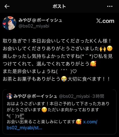 ヘブンネットで見つけてくれて、僕の出勤日数が少ないということもあり、わざわざ合わせてくれて、僕を選んでくれてありがとうございました😭✨️