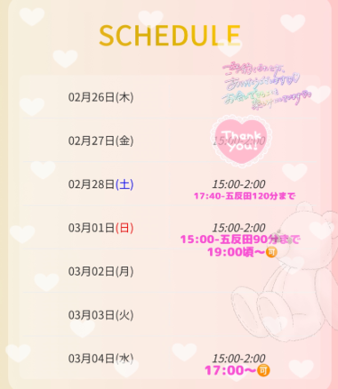 本日出勤 15:00〜翌02:00