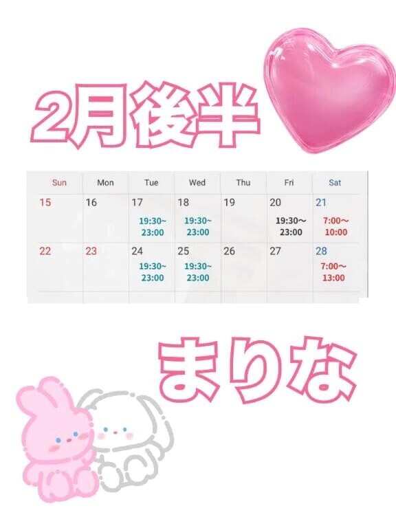 遅くなってごめんなさいっ2月の後半スケジュールですっ2月は閑散期と言われてるらしいですが…完売になってる日も多くてまりなはとっても恵まれてるなあとふと思いました残りの後半も楽しく過ごしましょうね体調やまりなの急用で変わるかもしれませんが、そのときはお知らせしますご予約はお早めにまりな🧸🎈