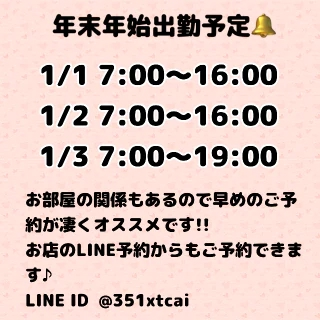 こんにちは✳︎年始のご予約して頂いているお兄さん、ありがとうございます(⁎ᴗ͈ˬᴗ͈⁎)♥️♥️お逢い出来る事心から楽しみ!!!✨✨二人だけの楽しい時間を過ごそうね🧚♀️💕まだご案内出来る時間帯あります♥️1/3が比較的に空いています🍒年始も混雑が予想されますので、早めのご予約がかなりオススメです楽しい思い出一緒に作ろうね♪₍๐•ᴗ•๐₎💕すず🔔