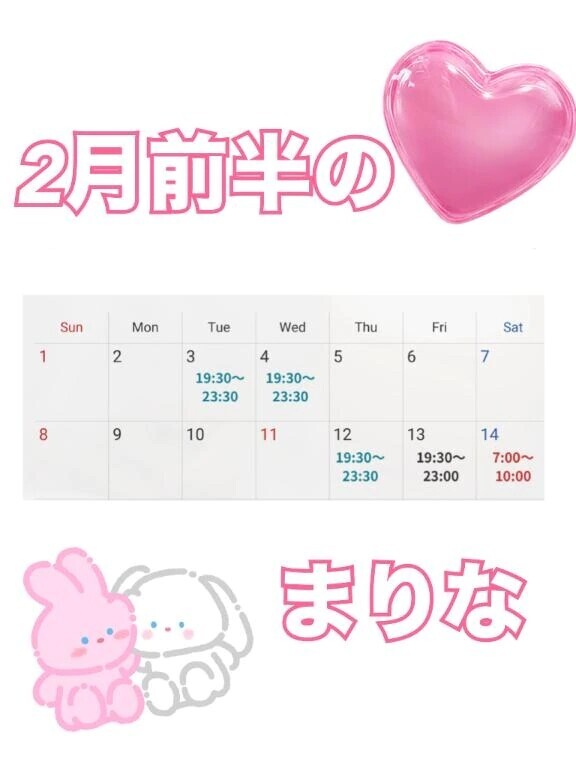こんにちはっまりなですお待たせしましたっ2月前半のスケジュールですっ♪2/5〜2/11まで女の子の日のおやすみです🧸夜デートは歓迎ですっ笑笑バレンタインは何しようかなあ2/12〜2/14で何かしようかなあスタッフさんたちにも相談してみます2月はスケジュールが変わりやすいかもしれませんっ変更になりましたら連絡しますっまりな🧸🎈