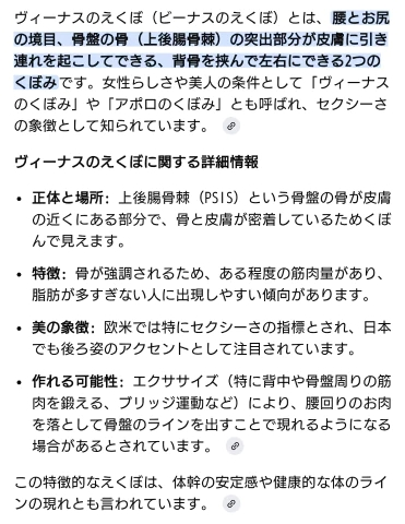 きのう教えてもらったんですけどおけつの上の窪みのことをヴィーナスのエクボと言うらしいですよ😳 ̖́-︎AIまとめ⬇写真だと分かりにくいケドも・・・お尻の上の凹みに、言われて初めて気がついた😆🙌🏻なんか嬉しい😆🎶一時期鍛えていたときのタマモノなのかなぁ🤭🩷さて早速待機タイムです⏰おけつエクボ、見に来て〜✌🏻💖