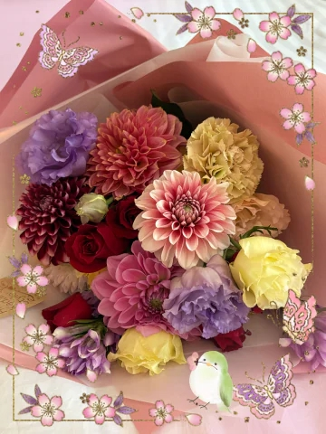 お部屋に入ると、ご指名様が楽しそうに花束の説明をして下さります。