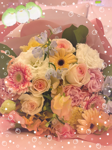 春を感じるような優しい色合いでアレンジされています。明るく優しい花たちを見ていると気持ちが明るくなります。
