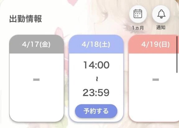 今日4/18(土)14:00-24:00出勤‼️