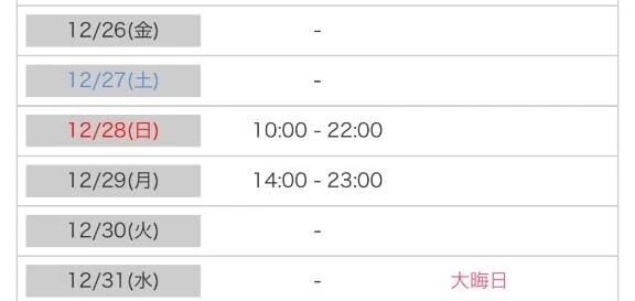 みきです年内は28日(日)10:00-22:0029日(月)14:00-23:00で出勤します!年末でお忙しいかもですが、もし会えたら嬉しいです☺️お待ちしています
